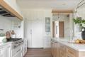 This custom new-build kitchen was designed to be the heart of the home. Designer Stephanie Pohlman Designs blended old and new styles to create a cozy, welcoming feel. Arched openings flank the statement plaster range hood. The space behind each arched opening serves as an additional prep space. On the right is a walk-in pantry with white oak cabinetry, and on the left is a butler’s pantry. The plaster hood along with the white oak beams and custom aged-brass fixtures are just a few of the Old World touches the designer incorporated. For a modern feel, the designer included a fluted, apron front on the island, drywall window returns and sleek plumbing fixtures. The custom arched built-in hutch serves as a separation for the breakfast room nook. The designer incorporated inset shelves for cooking essentials next to the range, a built-in bench for young children to perch and storage throughout. The new design is functional for the growing family.