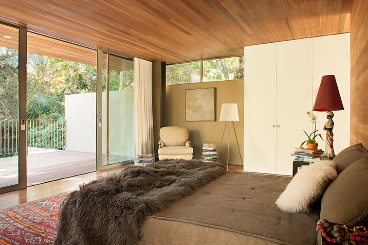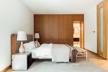 By Susan Taggart Design and Lloyd Architects. The goal of this bedroom suite was to create simplicity and rhythm through installing a series of wood panels, which hide the wardrobe, washer and dryer area and toilet room. Behind each panel of the lower and upper sections there are rods, shelves and pullout drawers for the storing of clothing and shoes. This allows the clients to store all of their essentials while maintaining a clean, seamless space. Photography by Mark Weinberg.