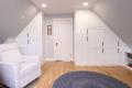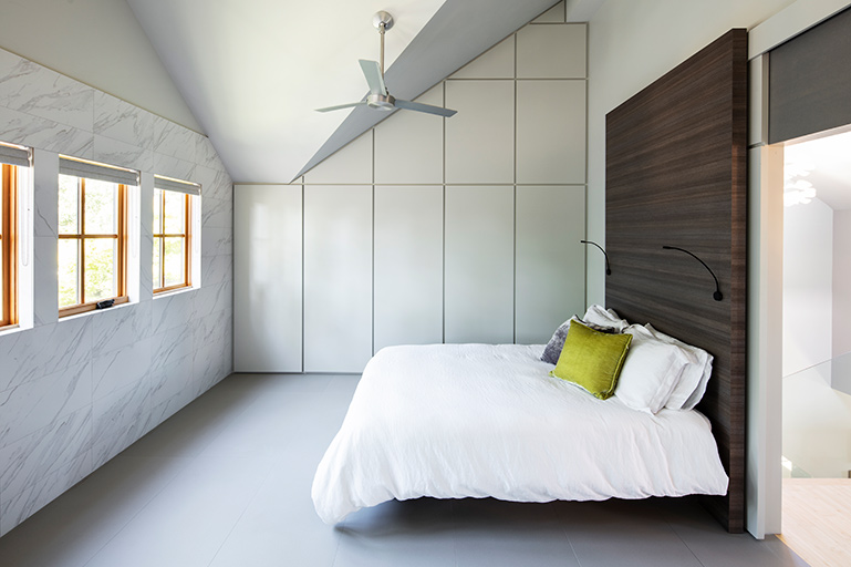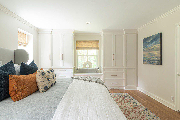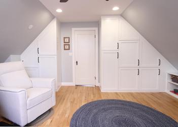 By NewSpace®. The 2nd floor space had no closets or storage, so the couple requested custom NewSpace® wood built-in cabinetry in painted-white wood with shaker-style doors, oil-rubbed bronze round hanging rods and pulls. The sloped roof was beautifully addressed with overlay doors on cabinet face-frame and low bookcases. Photography courtesy of NewSpace®.