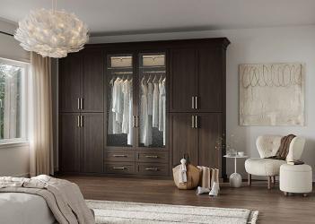 By California Closets Company, Inc. A rich wood grain finish and striking glass front doors make this wardrobe stand out. Crisp lines and accents of traditional crown and square base molding bring polished appeal to this timeless and functional design. Photography courtesy of California Closets Company, Inc.
