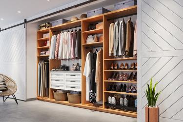 By Closet Factory. This custom wardrobe is behind barn doors and done in a light wood grain accented with drawers in white. It contains hanging storage for garments varying in size from shirts to long dresses and overcoats. The design further allows for shoe storage as well as folded clothes. Photography courtesy of Closet Factory.