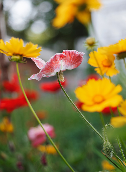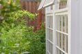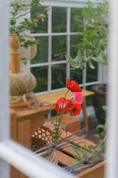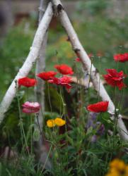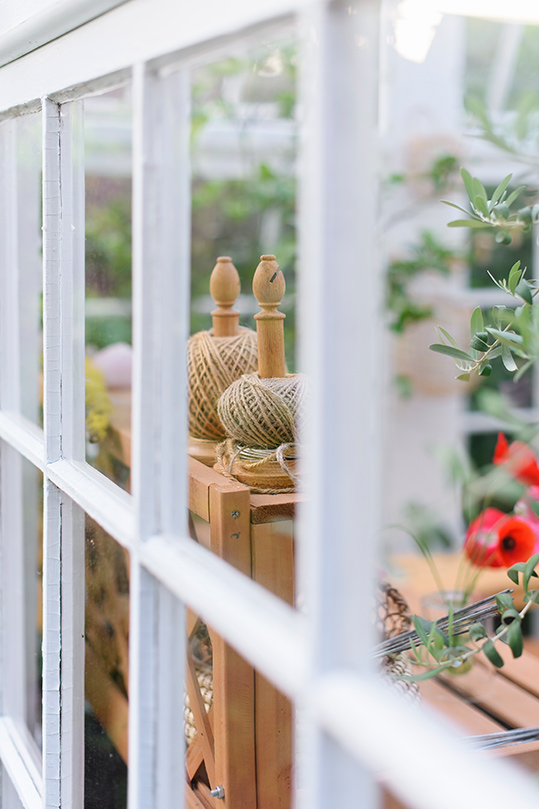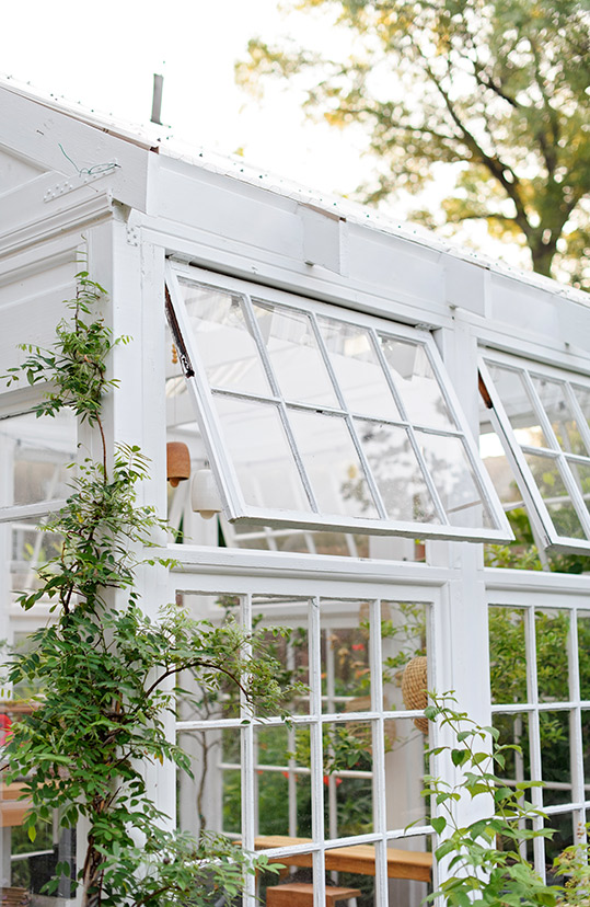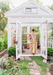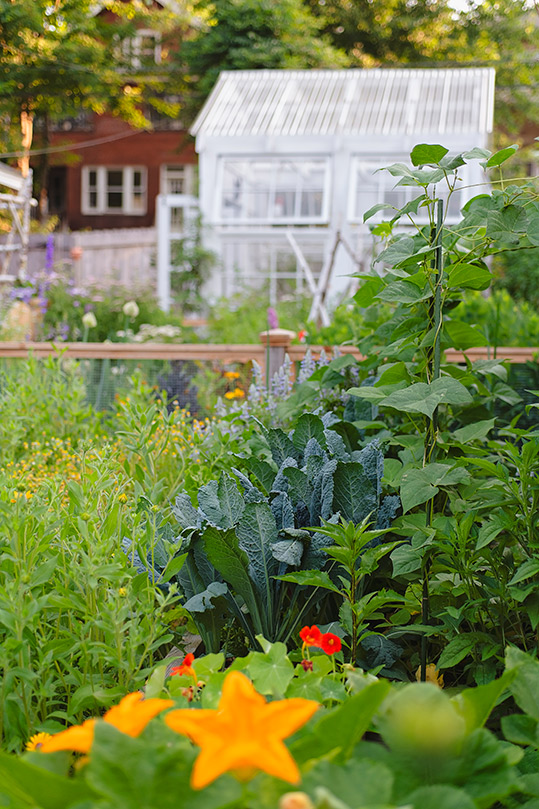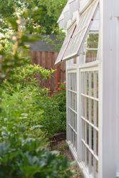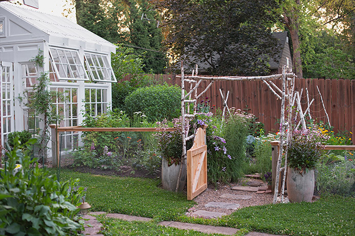 A white, solarium-style green house, constructed from the old wood windows discarded by a neighbor, is the perfect embellishment to the design of the garden. Lauren uses it to start seeds in the late winter and early spring and store supplies such as twine, flowerpots and vases in warmer months. “I like the continuity of the white of the poles and the white of the greenhouse throughout the garden,” Lauren notes.