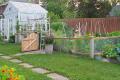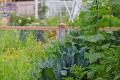 In a Mr. McGregor-sympathetic move, attractive wire fencing, stabilized with wood, encloses a large area of her garden and keeps out rabbits. Cages cover tomatoes to keep squirrels away.