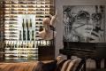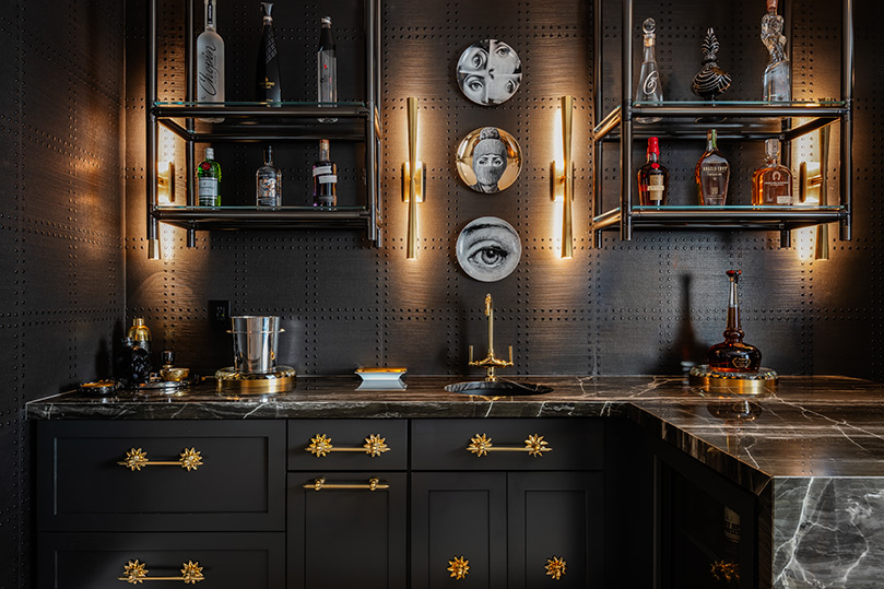 In the home’s lower level, an original two-tiered bar was replaced with counter-height Maximus Quartzite stone with a waterfall edge. A suspended shelf storage system from Architectural Elements adds an industrial vibe to the moody Phillip Jeffries hand-crafted wallpaper featuring a raised relief pattern. “This paper just makes everything pop,” says Tina. The collection of Fornasetti facial portrait plates nods to the homeowner’s love of pop art.