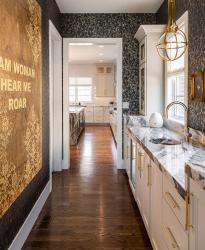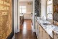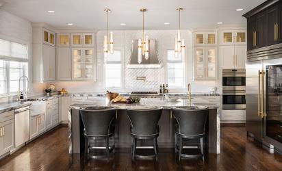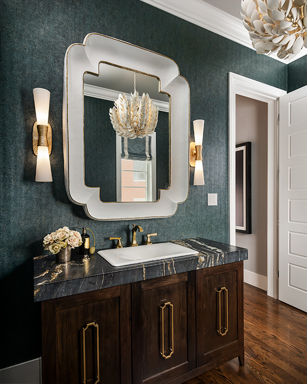 Selecting these features, each of them a standout, yet knowing when to “pull back” a little posed a fun professional challenge for Tina, the founder of Wolff Interiors. “We didn’t want too many of the elements to fight with each other,” says Tina, noting the thick, quartzite countertop “has a lot of movement” while the gold-leaf scalloped tile behind the range hood is very intricate. “Doing that tile only behind the range hood and not extending it along the entire backsplash area makes it art,” Tina explains.