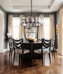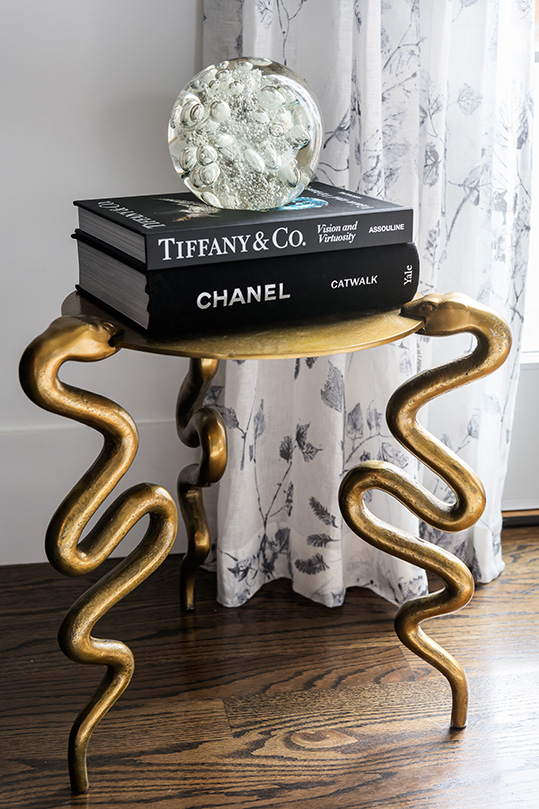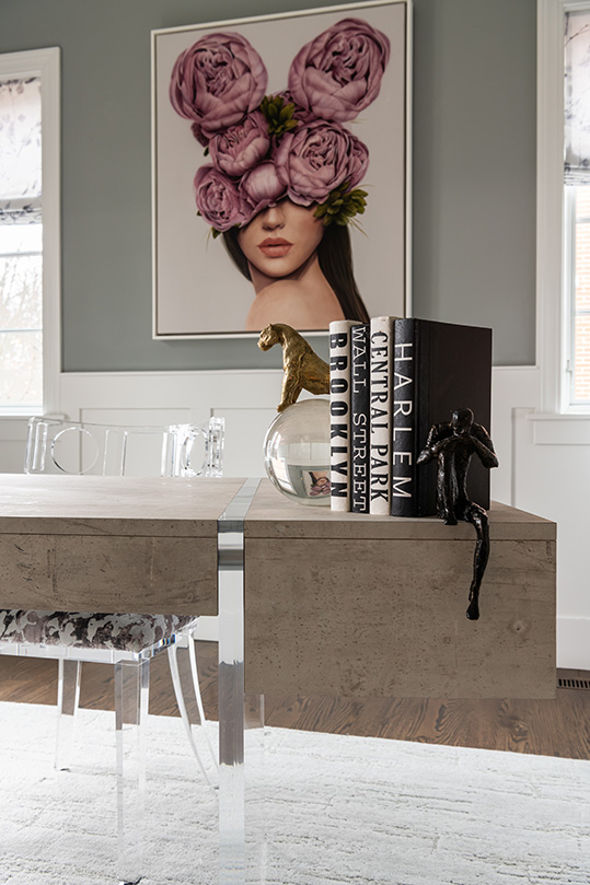 Fun, yet sophisticated. Classy but edgy. Interior designer Tina Wolff uses those adjectives to describe both this Clayton home and its owner. “She’s well traveled, and she has an art collection that reflects who she is,” Tina says of the homeowner. “She also likes a dab of bling, so all of those things together make the home and her style eclectic and interesting.”