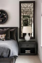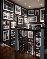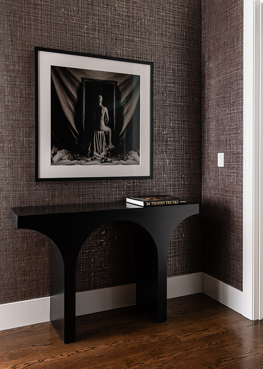 Case in point: the home’s stairwell. “It’s not a big open staircase, but it has very large walls,” says the homeowner. “And it just looked blah.” Inspired by her love of architecture and her travels, the homeowner obtained striking black-and-white professional photos of buildings and locales where she has lived and visited. A textured cork and metallic wallpaper provides the backdrop for the art gallery of photos hanging in the stairwell. “I think my love of art started with photography, particularly black-and-white photography,” she mentions. “Most of these are architectural photos because I just gravitate toward buildings, especially those in cities.”