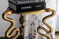 In the living room, neutral furnishings let the homeowner rotate artwork, both newly acquired and old favorites. On the room’s far end, a custom wine cooler occupies a former wall niche. “When I first moved in, we put a cabinet in this niche and a piece of art above it, and it was fine, but I just kept coming back to this space and thinking that this would be the perfect place to have a wine display,” says the homeowner. Custom acrylic and gold racking by VintageView holds about 300 bottles. Backlighting the Cristallo quartzite stone with LED panels turns wine storage into a work of art, complementing a new piece hanging nearby—pop art fashioned from one continuous piece of black string by contemporary artist Nemo Jantzen.