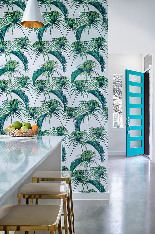 By CM Natural Designs. This space is all about high contrast and high impact. The drama and design are meant to evoke a hospitality feel within this client's home. The wallpaper offers energy, movement and color to a space that would otherwise feel a bit cold without only black and white finishes. Photography by Chipper Hatt.