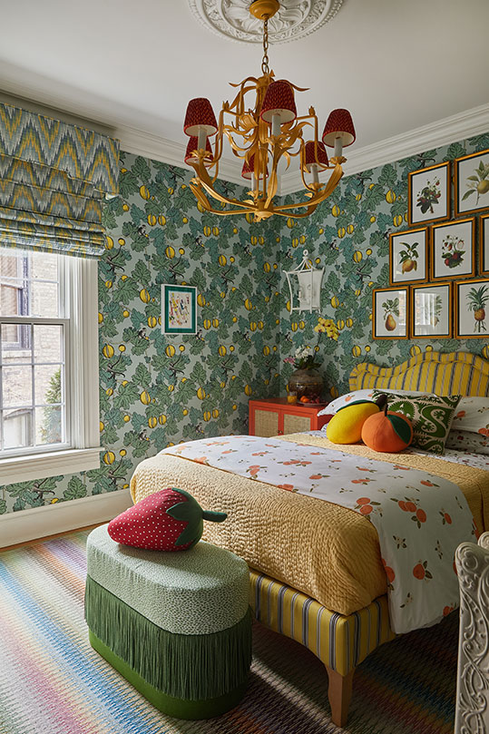 By Crystal Blackshaw Interiors. Located in an 1880 row house in Chicago, the home was renovated and restored for a family of four. This room is for a 10-year-old little girl who loves lemons and strawberries. Her favorite color is orange, so the designer went with a pattern-on-pattern fruit theme. Her playroom is located in another area of the house so the bedroom could solely function for sleeping and clothes storage while energized with colors and patterns. Photography by Heather Talbert photography.