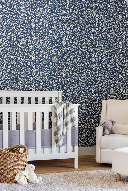 By Element Design Network. The designer wanted a true nursery wallpaper, not necessarily something that would grow with the client's son. They chose a darling Fox & Hare wallpaper from Magnolia in navy and used the wall behind the crib and glider as the focal point of the room. By only wallpapering that one wall, it can be changed out in the next couple of years to something that will stand the test of time. But for now, this sweet print is the backdrop to the cutest nursery. Photography by Erin Konrath Photography.