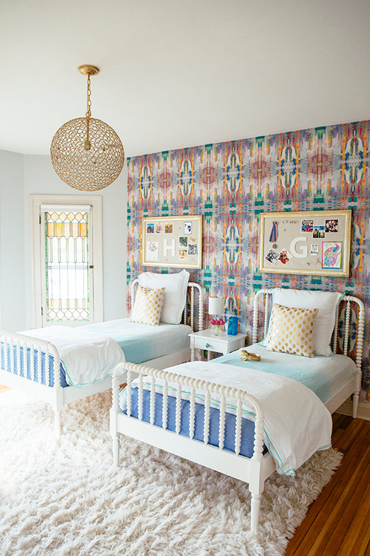 By Kate Taylor Interiors. This bright and cheery bedroom was created to reflect the sparkling personalities of some favorite little clients - a sister duo entering their tweens and teens. They gave the designer their favorite color combinations. The modern paper melds well with the historic and traditional bones of the home. Photography by Heather Talbert Photography.