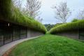 Architects designed the library to seamlessly blend into the surrounding greenery. They followed the slope of the land and plowed out parts to create a water droplet shape. A set of stairs leads visitors down from the point of the droplet and into the library below. Eliminating beams and columns to make way for concrete slabs that form the outer retaining and wing walls. The outer elements, floor, walls and ceiling, are given an “earthen finish,” and the lawn continues up the vertical edge of the concrete slab. The smooth blend of architectural and natural elements allows the space to remain concealed under the valley. The vertical extension of the lawn also allows for irrigation and water retention, both of which can be adjusted based on the season.