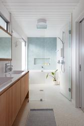 By Gast Architects. The clients made a strong effort to simplify the color palette because the views from the house are so spectacular. Fireclay Picket Braid tiles in the wet room were one of the few opportunities to bring gentle color to the living experience. To keep color use strategic, the rest of the wet room walls are Dekton. The cream-color Terrazzo was a perfect flooring material choice as it flows throughout the rest of the house and seamlessly into the wet room. A simple glass partition protects the blu Bathworks vanity from splashes. Photography by Mariko Reed.