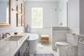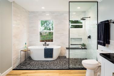 By TKS Design Group. This Chicago wet room features white and gray marble, charcoal blue cabinetry and gold accents keeping with the vintage vibe in the rest of the home. To create this modified wet room, TKS Design Group started by eliminating the shower curb, which enlarged the footprint of the shower all the way to the edge of the bathtub. Then the shower was pitched toward a linear drain, so the water stays in the shower while a glass divider allows light from the window to expand into the room. Lastly, the designer added a freestanding tub to complete the spa-like feel. Photography by Michael Alan Kaskel.