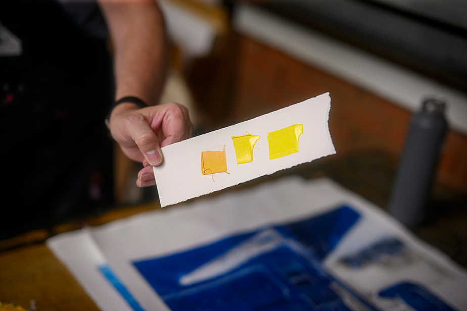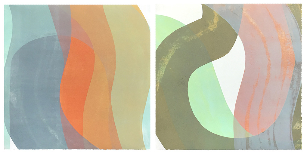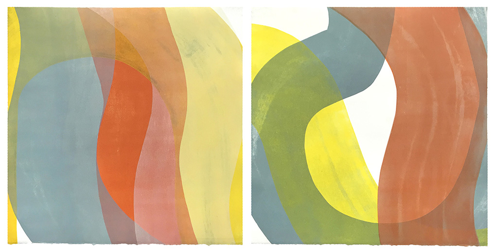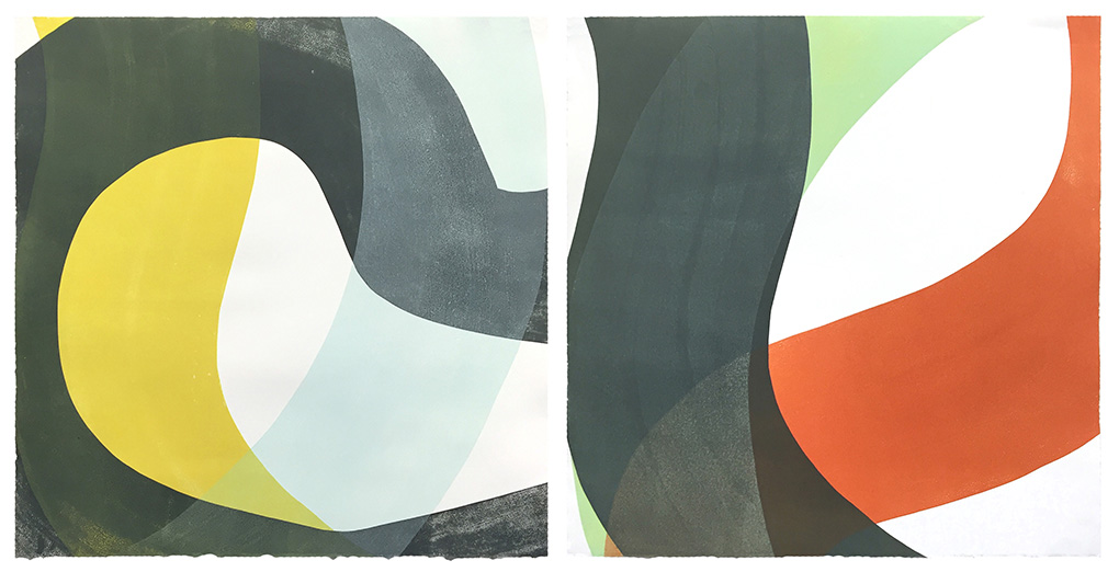 But he didn’t set out to be an artist. Wood actually went to college to study architecture. “But art kept pulling me away until I finally gave in, first with painting, then printmaking.” This latter artform, he says, was his entry into art. “Nowadays, I draw inspiration from unintentional compositions I come across in everyday life, like shadows overlapping patterns on buildings, or from color combinations I see.” He keeps a photo diary and refers to it when making his work.