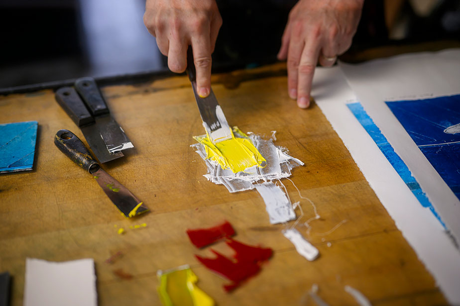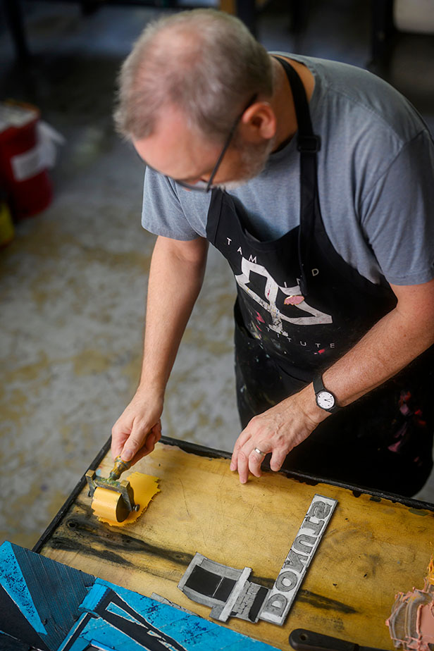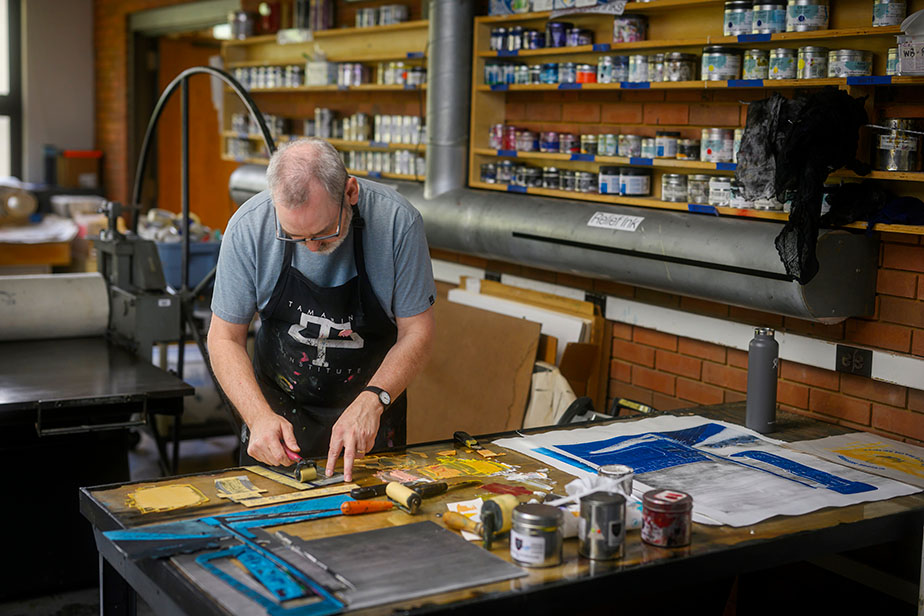 Art can take on many different approaches and styles. Ken Wood, an artist and professor at St. Louis Community College, combines relief printmaking, the more traditional process of printing, and collagraph printing, a process in which glue and fabric are used to add texture to a print. The end result under Wood’s artistic eye is a smattering of colorful shapes swirling across a white background.