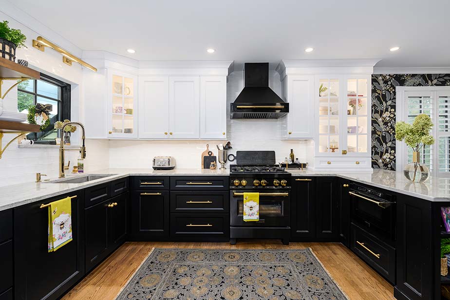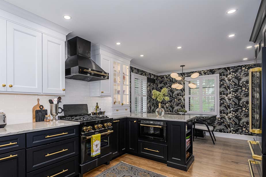 The homeowner transformed this 1930s kitchen into a functional and inviting gathering area. To improve the layout, they removed a wall between the kitchen and dining area and widened a hallway entry to seamlessly blend the two spaces. For additional counter space, a peninsula adds more meal prep space and an area for guests to gather. Modern finishes like updated hardware, sleek appliances and fixtures and an elevated aesthetic complete this efficient, bright kitchen.