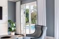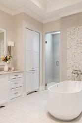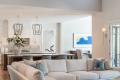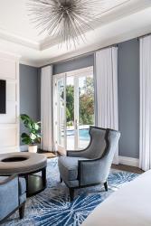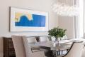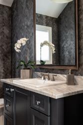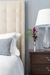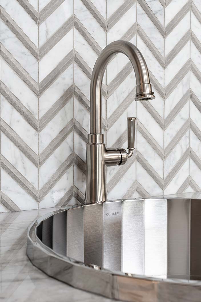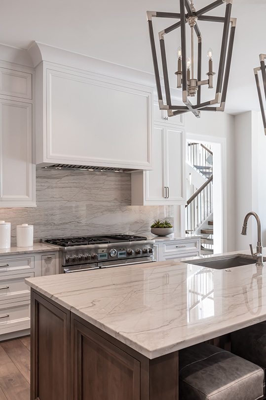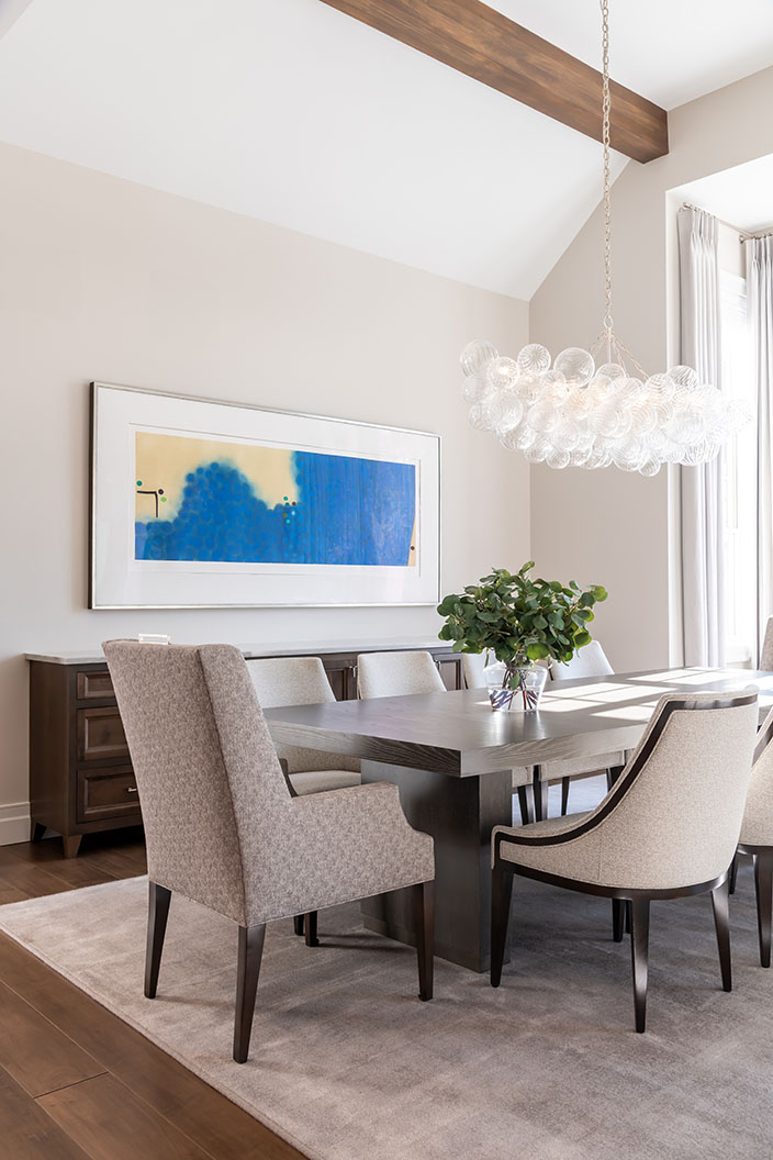 Leslie says the couple wanted upscale finishes but wanted the house to feel homey as well. “They like a clean, modern aesthetic, not too casual but still welcoming,” she says. “They love the play of mixing warm neutrals and cool neutrals together, which is what we did for furnishings and finishes, with adding a bit of color with artwork, pillows and other accessories.”