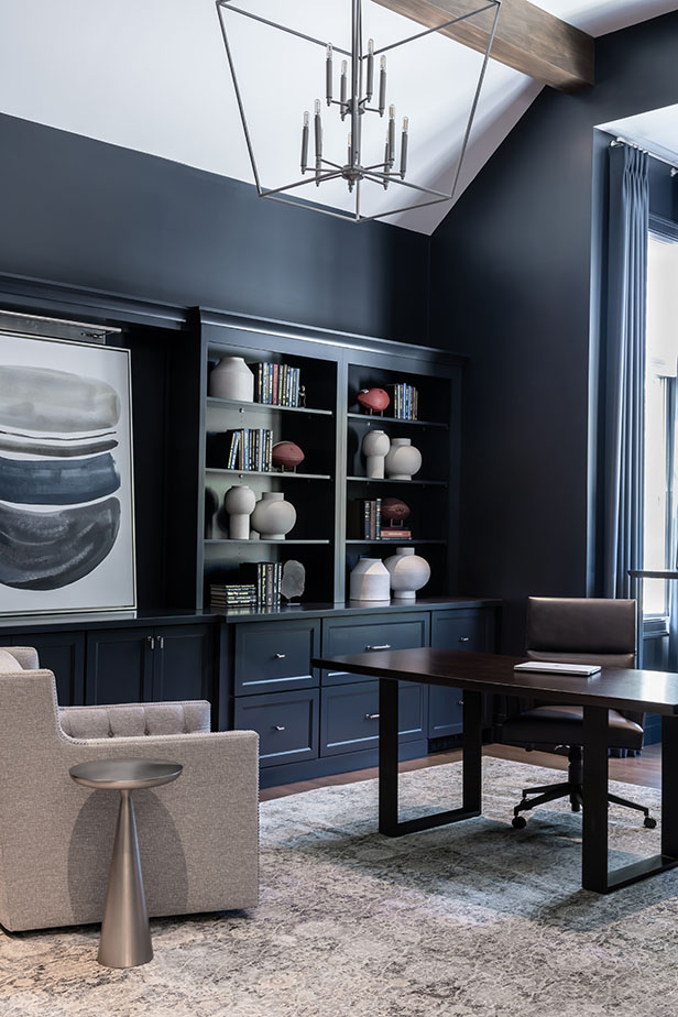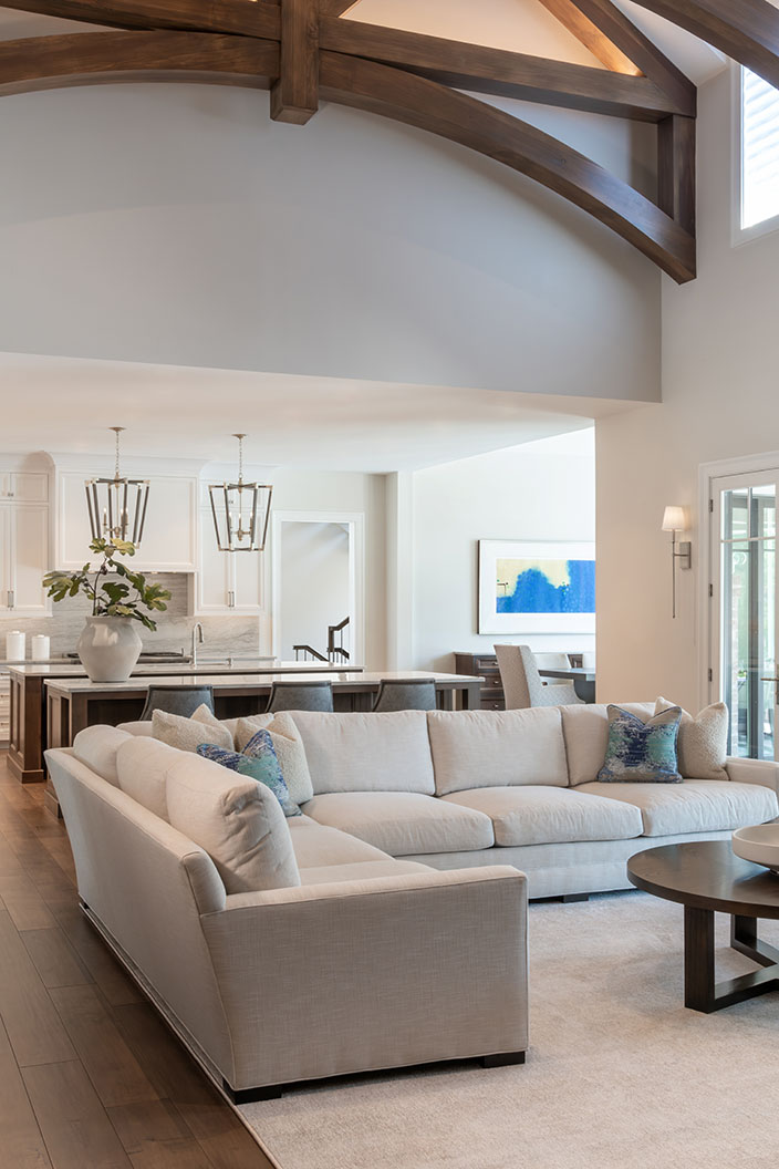 In the great room, for example, Leslie planned neutral pieces upholstered in performance fabrics. The soaring two-story room is visually lowered with detailed wood ceiling beams. “The idea was to take this tall, impressive room but give it a more intimate feel,” says R.E.A. Homes, noting creating cozy spaces is part of what makes the home feel comfortable for the homeowners.