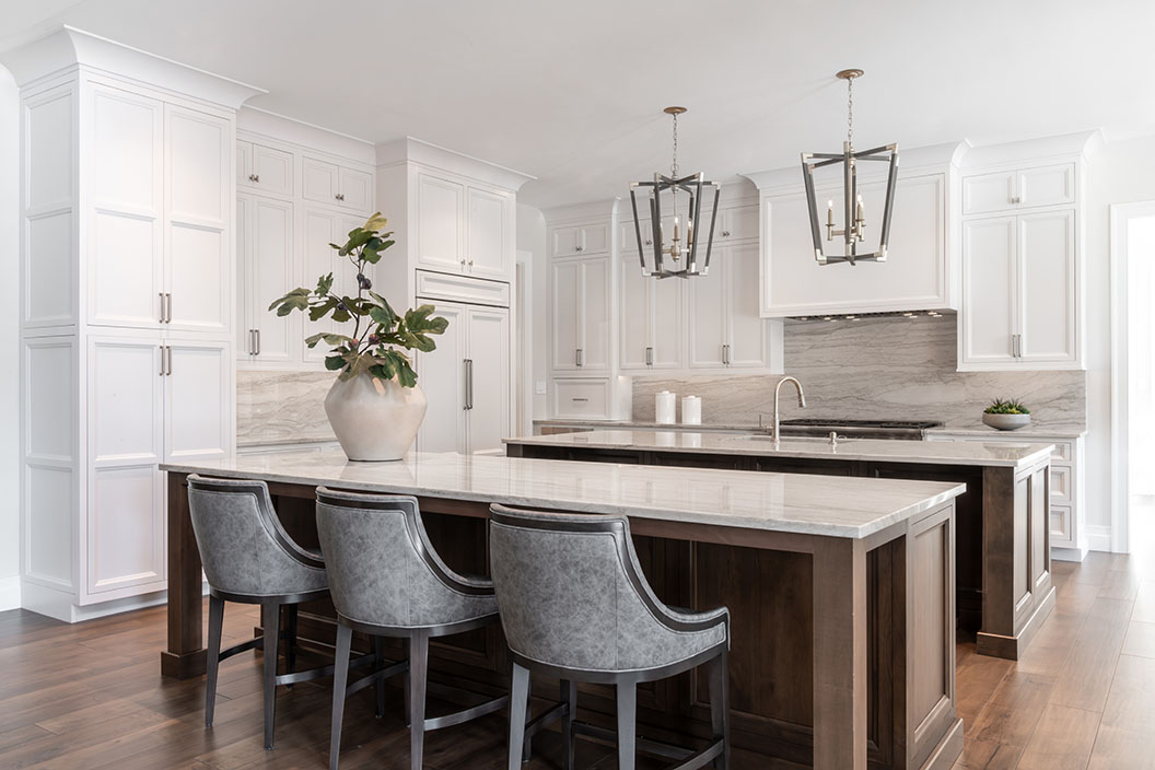 The great room flows into the large kitchen and adjoining dining area. “Between the two islands and the adjacent dining table, they have a lot of surfaces for whatever type of event they’re hosting, and they have seating for eight at the islands,” says Leslie. Seating at the sink island was a tweak during the building process based on the husband’s idea during a site visit. “We use those stools all the time when entertaining,” says the wife.