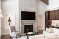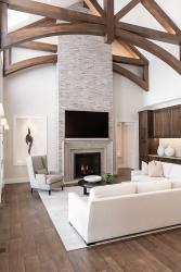 The room’s tall fireplace is constructed of ledgestone tile with a mantel and surround of Missouri limestone. “I wanted the color of the tile and the mantel to be very complementary so it would read more textural rather than contrasting,” says Leslie. “I wanted the focus on those larger architectural elements as a whole and bringing the eye up.”