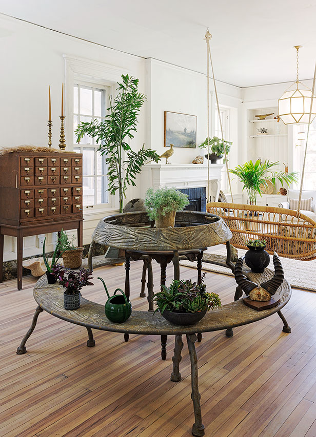 They combined two rooms to create a “long room,” to have a large entertainment space. Britt wanted a round piece of furniture in that room. She purchased a tree ring she’d seen at an outdoor store in Virginia and it fits perfectly, providing a unique place for seasonal displays, plants and seating during parties. JP also spent weeks redoing the room's floors in a Swedish wax-finish after they were unable to find someone locally who could do the technique. Additionally, they installed a swinging love seat by Serena and Lily. “It lets us see the garden in the back,” she says.