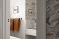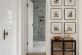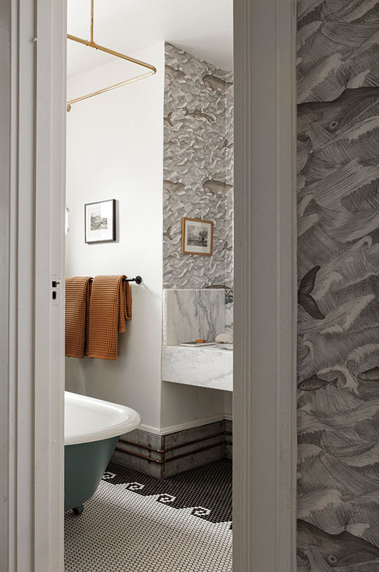 Britt sought out the whale-themed bathroom wallpaper after seeing it in a restaurant in New York City. She had plain black tile replaced with tiles depicting waves to tie in with the ocean theme.