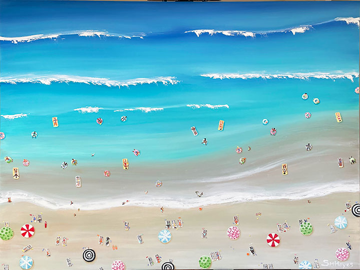 The work for the church follows another recent piece she’s created, a contemporary figurative oil painting called “The Ascension” and depicts Christ being lifted into the heavens by a band of singing angels. For Hayes, she sees the two works as complementary, as both depict Christ but offer two very different styles she excels in: abstract pieces and more contemporary figurative oil paintings. While the church mural looks at the glory of figure, the oil painting reminds viewers of the arduous experience he underwent, with the black background noting the darkness Christ is being lifted from, his wounds have been healed, but signs of exhaustion are evident in his expression. “The oil painting will be at auction and the money raised will be donated to a charitable foundation in honor of Monsignor Nicholas Schneider, who passed during Covid, but no formal memorial could be held,” she says. As with her mural in the church, Hayes hopes her art can bring light from darkness. See more of her work at HayesFineArts.com.