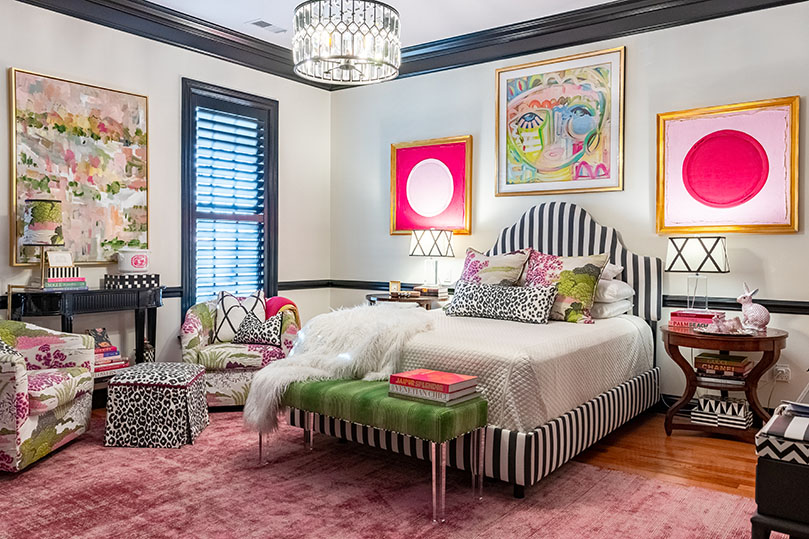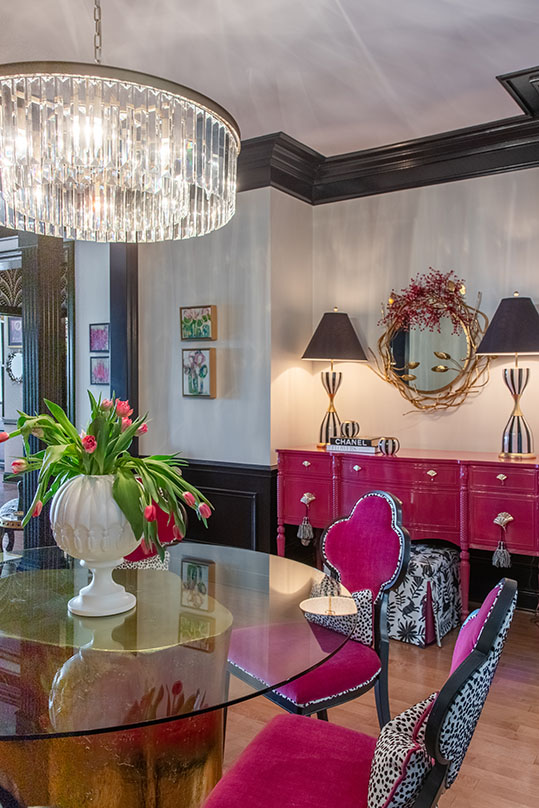 Vibrant pops of color punctuate each room through custom artwork, playful fabrics and unique accessories. Pink serves as another focal point, also making an appearance in nearly every room, from blush velvet stools to a hot pink buffet. “While pink and black were the colors we really wanted to highlight, we pulled out other bright colors from the homeowner’s incredible art collection,” says Carol.