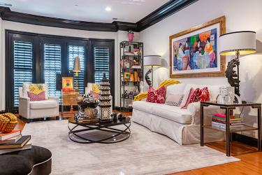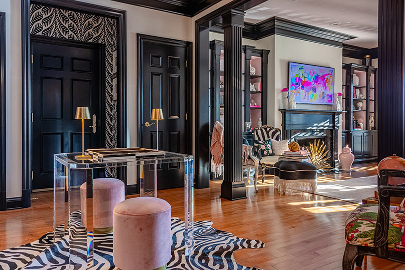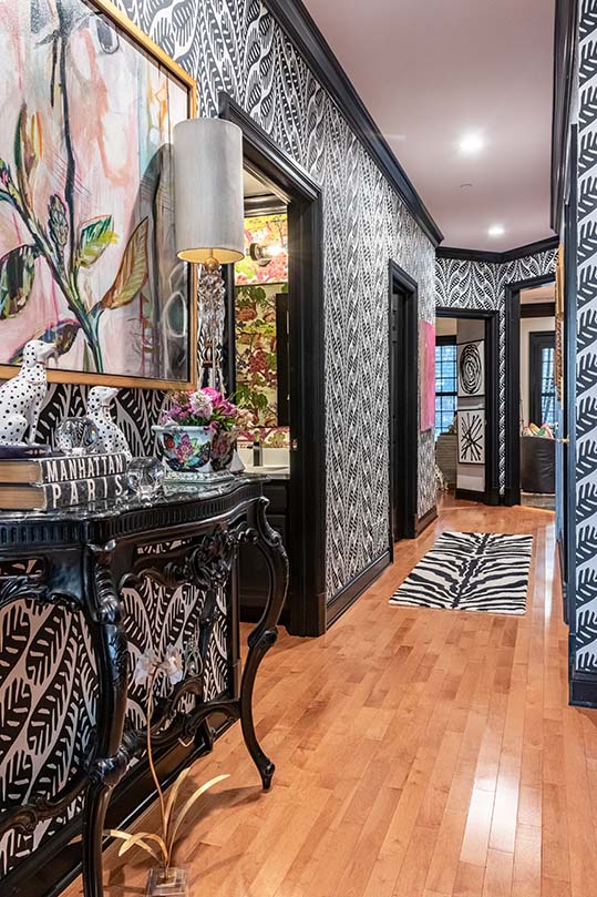 Black anchors the design throughout the condo, found in every room whether in a metal coffee table, striped lamp or cheetah print chair. The hallway is also lined with a dramatic black-and-white wallpaper that makes a statement with its striking pattern. The ceilings are painted a soft blush, giving contrast to the darker hues and a subtle nod to Barbara’s favorite color. By keeping the foundational elements of the design bold yet neutral, the perfect backdrop for colorful accents was created.