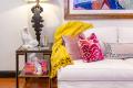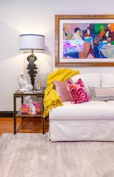 The lively and feminine colors found in Barbara’s unique collection of art, most by female artists, bring even more personality to the space. Greens found in chair fabrics and a lime green bench at the foot of the bed, vibrant yellow pillows and throws, and other colorful accessories tie the design together. Each piece feels expertly chosen and placed, but cohesive enough to fit in any room. “I wanted the items in my home to feel unique but go together enough where I could mix and match. You can easily move a pillow from the living room to the bedroom and it will still look great,” says Barbara.