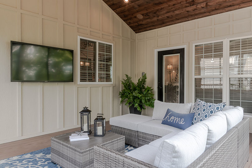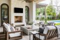 By Hollenbeck Architects. Designed by Houston architect, Brad Hollenbeck this amazing outdoor living space reflects a laid-back serenity with a West Coast vibe. Spanish-colonial inspired, it has polished concrete floors, wood plank ceiling and a beautiful stone fireplace. Great for entertaining, it has a custom screen system to ensure comfort on sunny Houston days. Photography by Julie Soefer.