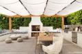 By Unique Landscapes. This serene outdoor retreat blends Mediterranean-inspired design with modern sophistication, featuring a white stucco fireplace, built-in seating with striped cushions and a canopy-draped pergola. A natural wood dining table anchors the space, complemented by a fully equipped outdoor kitchen and relaxed woven textures throughout. Framed by lush greenery, the setting invites effortless entertaining and quiet moments alike.