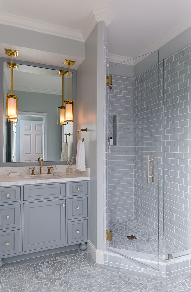 The project was in Menlo Park in the San Francisco peninsula. This guest bathroom is for a busy young couple with three small children. The homeowners wanted a bathroom that was special and welcoming for guests with a timeless design and colors. The gold fixtures, along with the marble tile on the floors and the ceramic tile on the shower walls, helped create a luxurious feel in this small space.