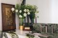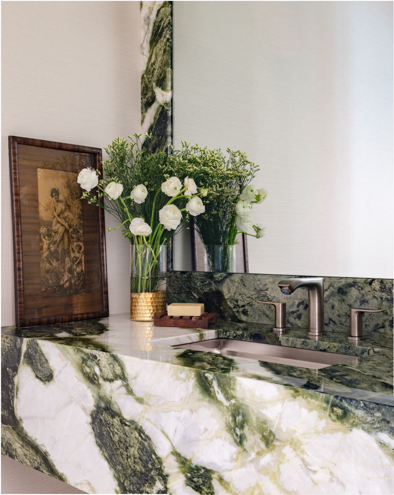 Careful detail is evident when observing the natural banding of the marble vanity—the artisan shows intention with how beautifully aligned the cut is in tandem with the direction of the banding. The overall look of the room has an uncommon “cosmopolitan flavor” that demands attention as a work of art.