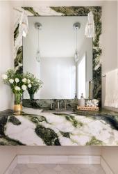 The designers chose Verde Calacatta marble with its strong color and veining as the star of this powder room. Extra attention was given to ensuring that both the walls and fixtures were kept simple, yet complementary in order to add texture and lightness to the room. The room was finished with a playful circle and diamond marble floor with marble base molding in a similar tone to the wallpaper, giving the floor personality without overpowering the vanity marble. Decorative light fixtures perfectly mirror the stone pattern and keep with the modern theme of the room.