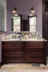 Artistically inclined homeowners envisioned a primary bathroom that honored the architectural heritage of their Tower Grove East home, while embracing bold choices in material and color. Staying true to the home’s early 1900s roots, modern elements are layered with industrial brass plumbing fixtures set against dramatic Viola marble countertops and carved Carrara wall tile. Pressed glass lighting, a new clawfoot tub, rich stained wood paneling and a carefully sourced vintage chandelier add period-appropriate charm and texture, striking a thoughtful balance between old and new.