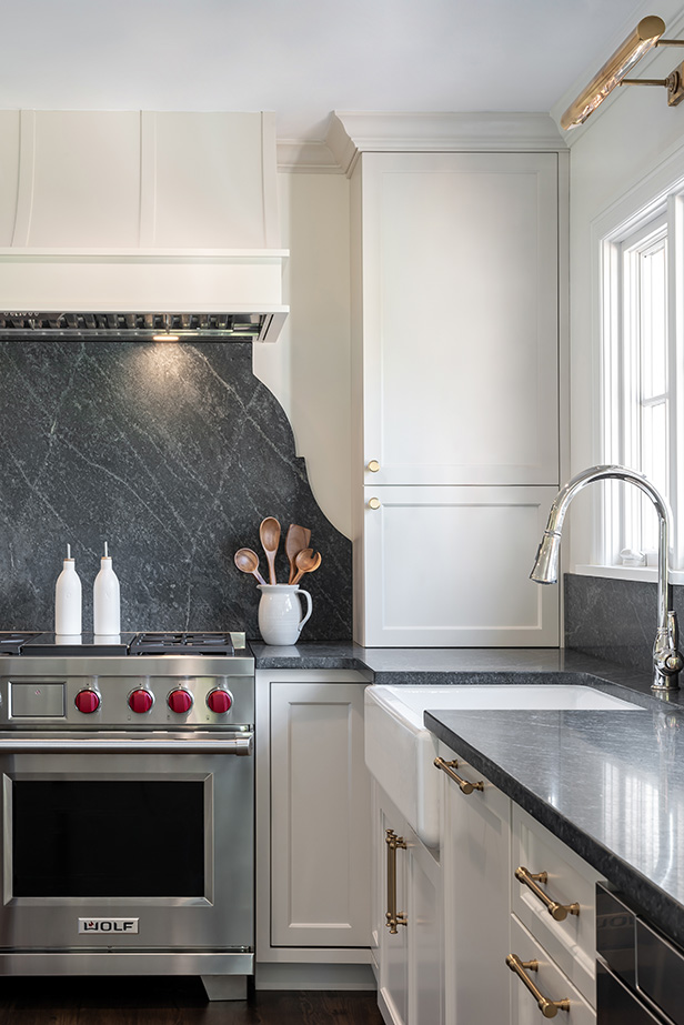 Julie confirms it was easy to work with Jessica, who never got frustrated when they pivoted to incorporate additional ideas. “For example, I was very specific on how I wanted edges to look on the large piece of soapstone behind the gas range. Many renderings were requested to get it just right, and Jessica was just as happy as we were with the outcome,” she adds.
