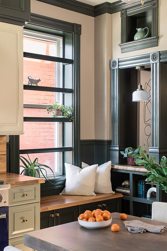 "My friend, coworker and Rosette's lead carpenter, Joe Brown, did a lot of work on this space with me," notes Webb. "He drafted CAD designs for the cabinetry and coffered ceiling and was there in person to hold the other end of long sticks of crown molding. A huge highlight was having him and my family over after the project to break bread and thank him for his help seeing it through."