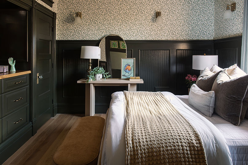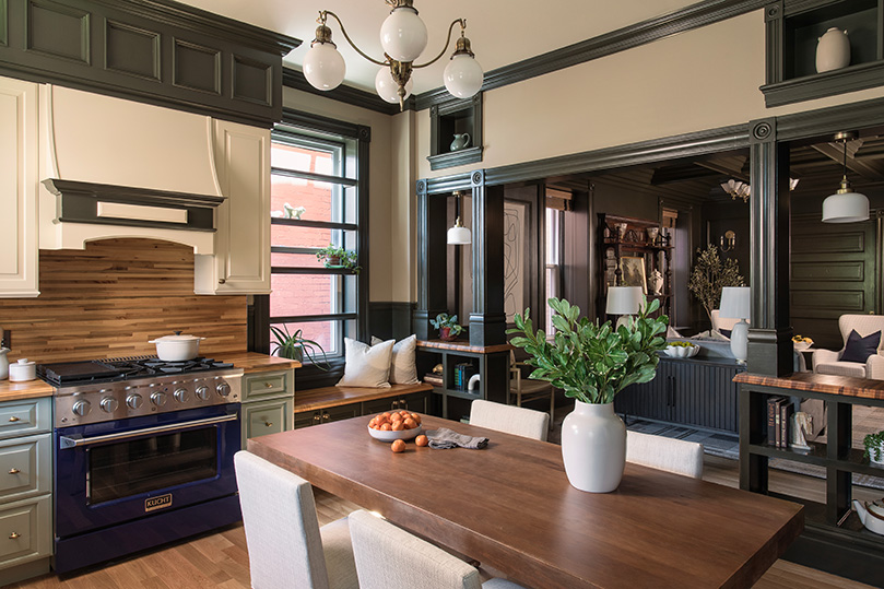 Inspired by Victorian architecture, the interior aesthetic includes elaborate plinth block bases, butterfly casings, rosette corner blocks and tall two-piece base trims. After recreating much of the existing interior millwork, Webb expanded upon it greatly for architectural drama. Soaring 10-foot ceilings allowed for more layers of crown moldings, soffits and interest boxes. The magnificent two-tiered coffered ceilings are perhaps only surpassed by the installation of a one-of-a-kind, hand-carved mantel with a fluted texture tile reclaimed from a now-demolished house in North St. Louis. Balanced by the white oak flooring they installed throughout, the couple implemented a dark, earthy and sophisticated interior paint palette that nods to the woods of Missouri, as seen in the many stained-glass Transoms.