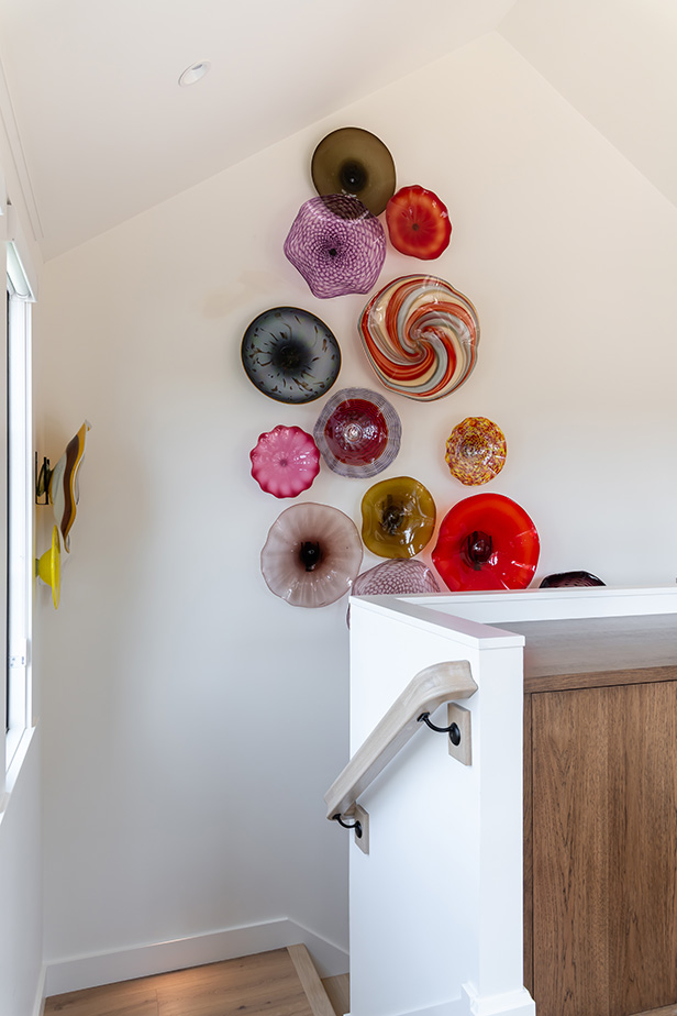 Additionally, hand-blown glass plates from Central West End-based Third Degree Glass Factory cascade up the home’s stairwell providing movement and a touch of whimsy to the space. Bold and bright, the glass plates lead the eye toward the second floor.