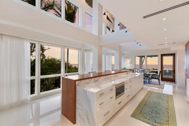To ensure unobstructed views from the kitchen to the outdoor spaces, upper cabinets were installed only along the cooktop wall. “Lighting was reimagined to bring task light to the island, but it was discreetly tucked up out of the sight lines,” Gigi explains.