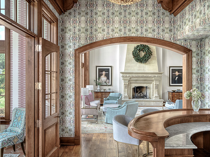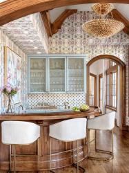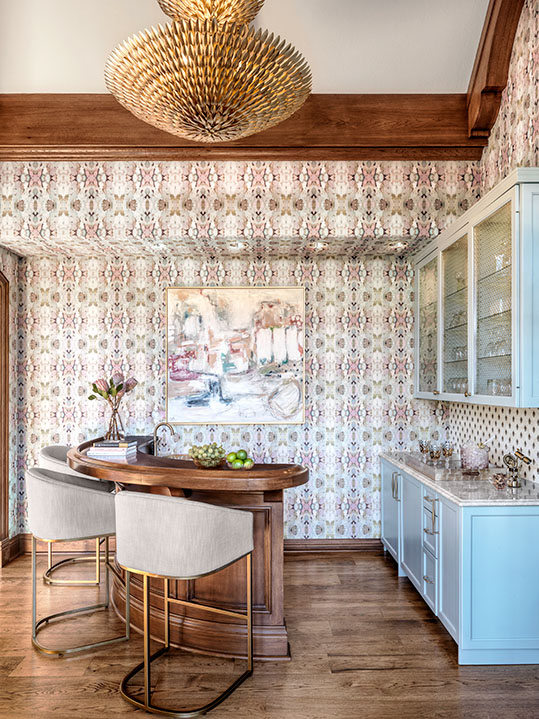“It’s where I often spend my evenings curled up in a chair with a book, listening to the gentle busyness of the house,” she said. “From there, I can see up the stairs to my children’s bedrooms and into the kitchen and sunroom. I love taking in the beauty of the great room while feeling connected to everything happening throughout the rest of the home.” The great room’s subtle elements flow into the wet bar, where the patterns are a bit stronger.