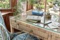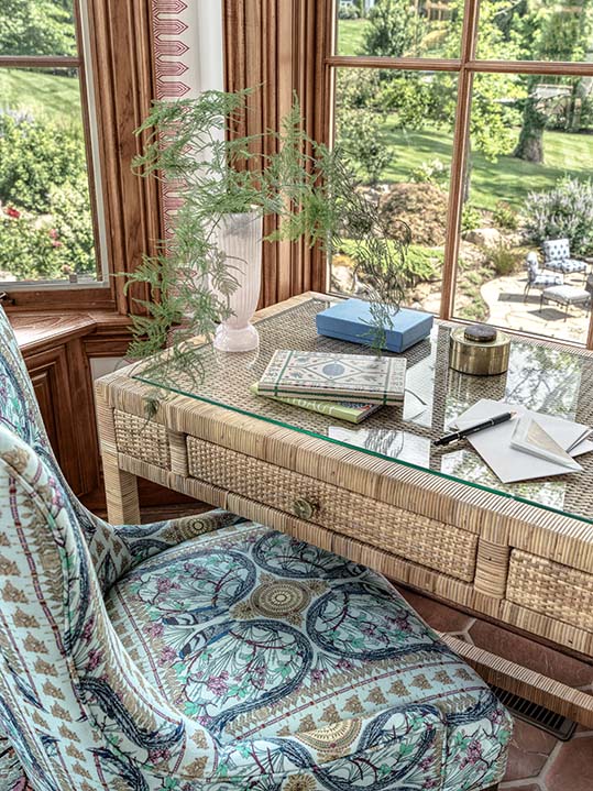 The sunroom brings in even more color and pattern. Originally functioning as a playroom during the family’s early years, the space has transformed with their needs while maintaining a casual feel. It is now used to share a drink with friends, play a family game night, take a Zoom call or simply have a quiet moment to escape the busyness around them.