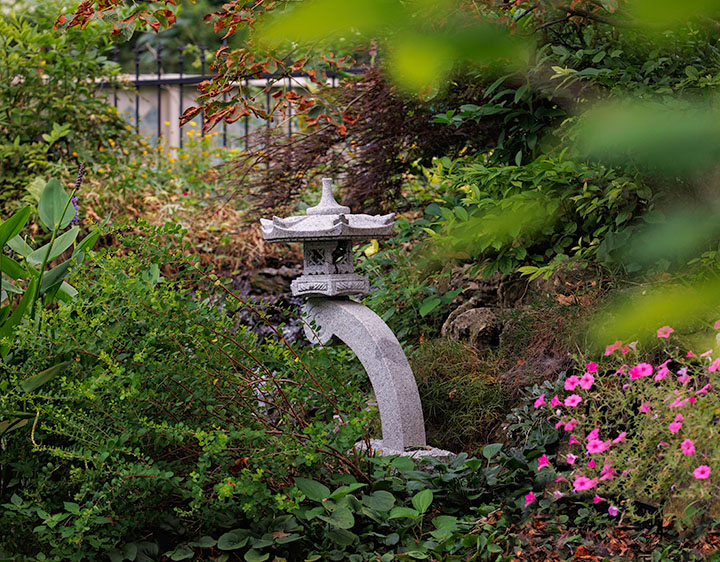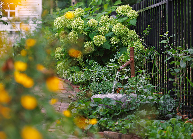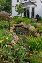 One of the homes on that tour had a stream that accented the front yard as well as the back yard, something Don thought could work in his own space. To make that happen, he contacted Caleb Bauer of Bauer Falls and asked him to help create a landscape that would bring both water and his native plants together. Caleb was immediately on board, particularly in the creation of the “little stream in the front yard. We wanted to have something for the neighbors who walk along the cut-through, providing the beautiful sound of water,” he says. Caleb also created a series of stone bridges and walkways through the garden to allow the landscape to be viewed from a number of different vantage points by those inside the garden fencing.