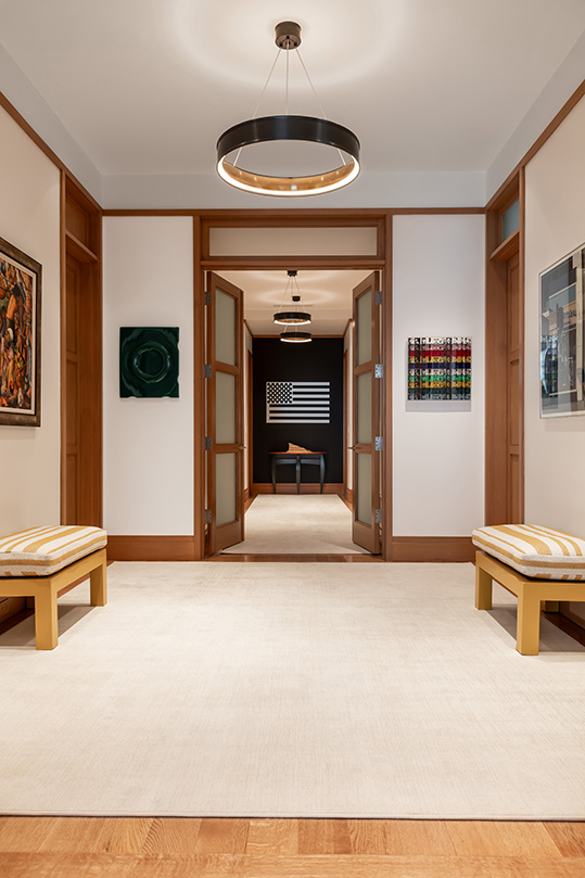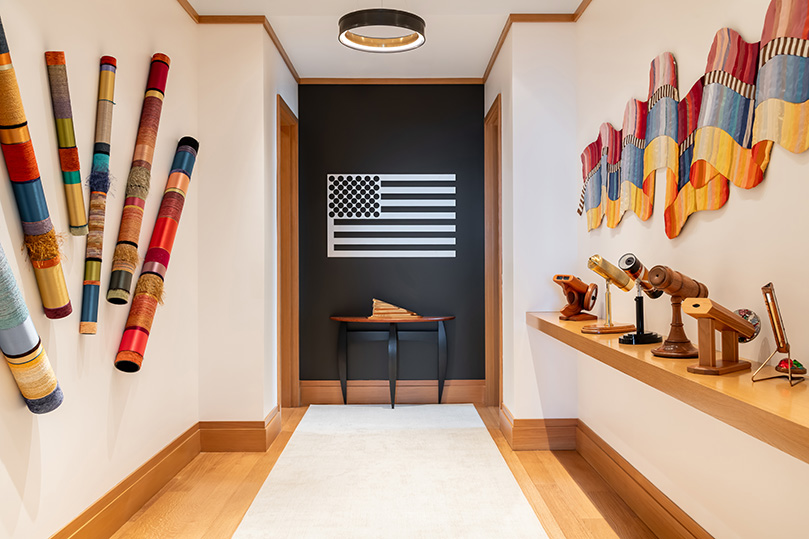 The couple also selected the penthouse for its east- and north-facing orientation, maximizing natural light and unobstructed views, with no sun bleaching or heat that would impact their artwork or the dwelling’s refined finishes. “The design of our new restoration works to enhance the hand-selected raked white oak woods in the condo,” says the couple’s interior designer and project design manager, Garrison Salinas III, a principal at the firm Garrison Limited. He had previously worked with them multiple times, conceptualizing three different homes over the years. “The interior palette elevates the owners’ contemporary artwork and impressive collections of vintage tin signs and kaleidoscopes. Based on the level of high art, including original pieces by Jasper Johns, and the scale of their collections, every choice in finishes is intended to maximize impressions of the space and the calm it induces, without competing with the endless sky views.”