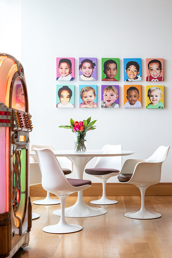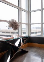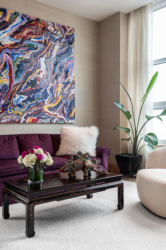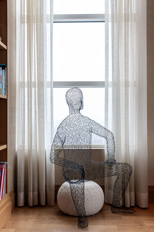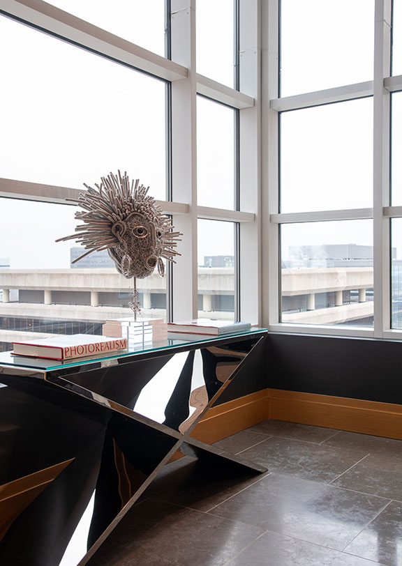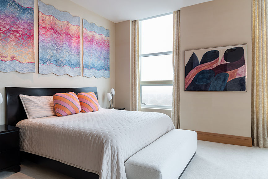 The penthouse offers the new owners everything they need to achieve a nearly stress-free lifestyle. Their most cherished luxury, however, is gaining the time to enjoy their lives fully. The quiet, serene and simple Zen atmosphere of the building focuses on anticipating the needs of all its residents. “We love the views, the ceiling heights and the walls of windows juxtaposed with entire walls of our artwork,” adds the homeowner. “Our art choices are not traditional in any way—certainly not for everyone, and more whimsical than serious. The principle we’ve been guided by for over 40 years is to collect what makes us smile.”