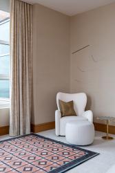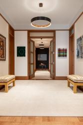 “Their unit originally had been designed by a New York team, and the aesthetic was modern with beautiful raked white oak millwork for all the cabinetry, flooring, wall panels and interior doors," says Garrison. The unique grey-green limestone in the entrance foyer, formal powder room and various areas of the penthouse specifies a soft matte finish. The overall aesthetic is reminiscent of sophisticated mid-century modern architecture.”