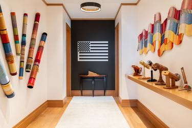 The home’s previous lighting embodied a robust commercial aesthetic, contradicting Garrison's new approach of warm and serene modern finishes. Textured Phillip Jeffries grass cloth now adorns the den, primary bedroom and home office, and statement fixtures from Visual Comfort magnify the ceiling heights and provide warm, 3,000 Kelvin-rated dimmable lighting. Satin brass fixtures create a confident statement of minimal modern design combined with the visual energy of sculpture hanging from the ceiling in the salon, primary bedroom hallway, gallery and over the kitchen Island.